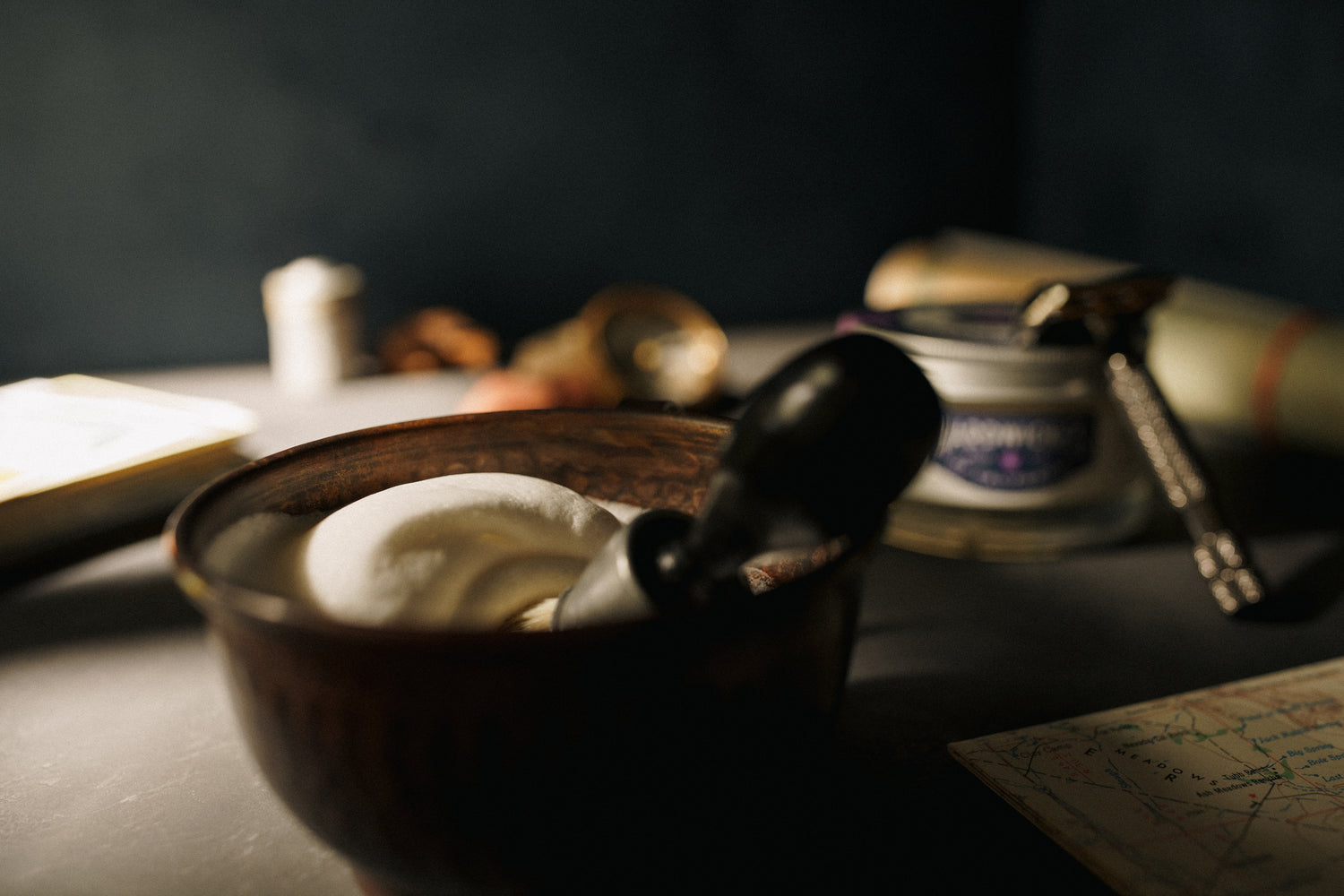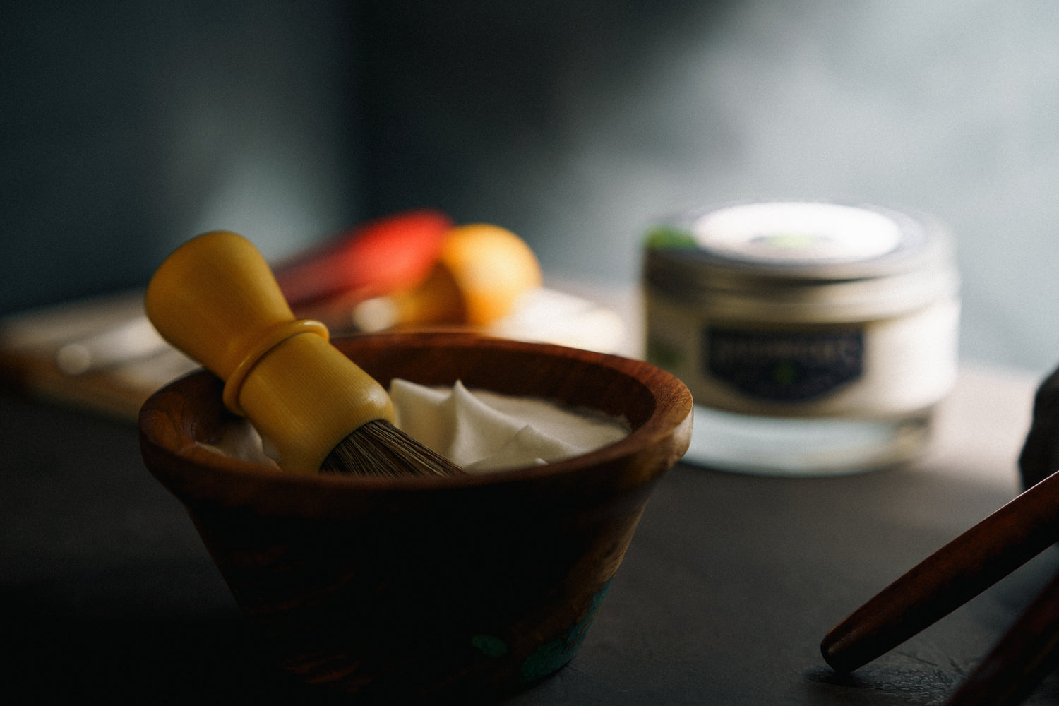 Varying the moisture level in the brush lets you control the density of the lather in your bowl: too wet, and the lather will be thin and fluffy – too dry, and it will be dense and flat. You can get the brush fully wet with warm water, then gently shake it out to the desired level.