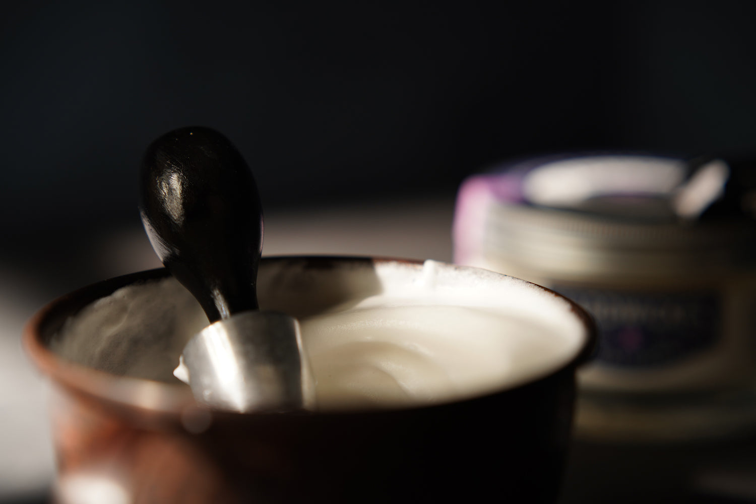 With your finger, scoop about a gram of cream (the size of an almond) out of the jar and smear it in the bottom of your shaving bowl. Whip it up with your moistened brush until it has a consistency like whipped cream. Then use the brush to apply it to your face. Shave, rinse, and enjoy your day!